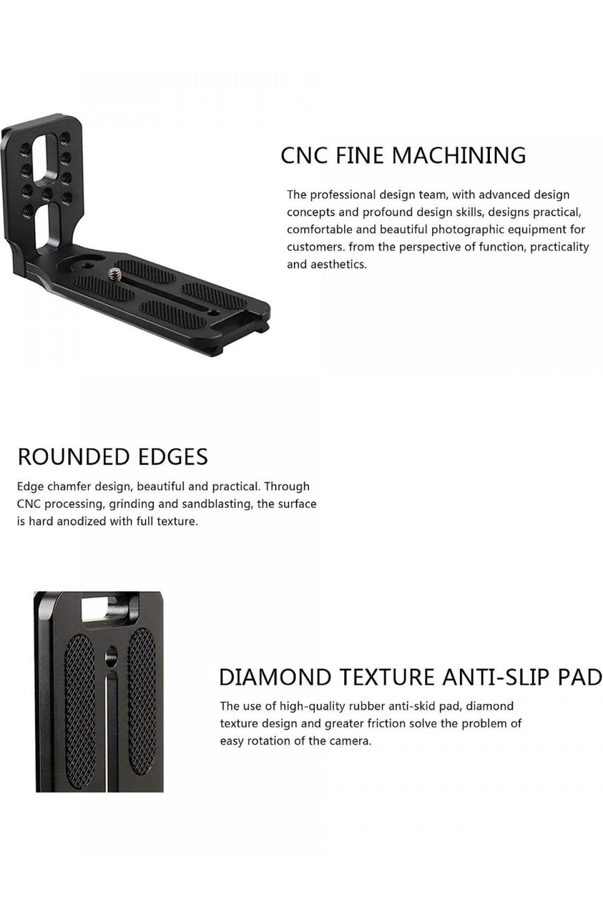 Fotoğraf ve video çekimlerinde maksimum stabilite ve esneklik sunan Kamera L Braketi, hem dikey hem yatay çekimlerde hızlı geçiş imkanı sağlayarak yaratıcı çalışmalarınızı kolaylaştırır. Havacılık sınıfı alüminyum alaşımdan üretilmiş gövdesiyle dayanıklılığı artırılmış, kaymaz vidalar ve lastik pedlerle donatılmış yapısı sayesinde cihazınızı güvenle sabitleyebilirsiniz.